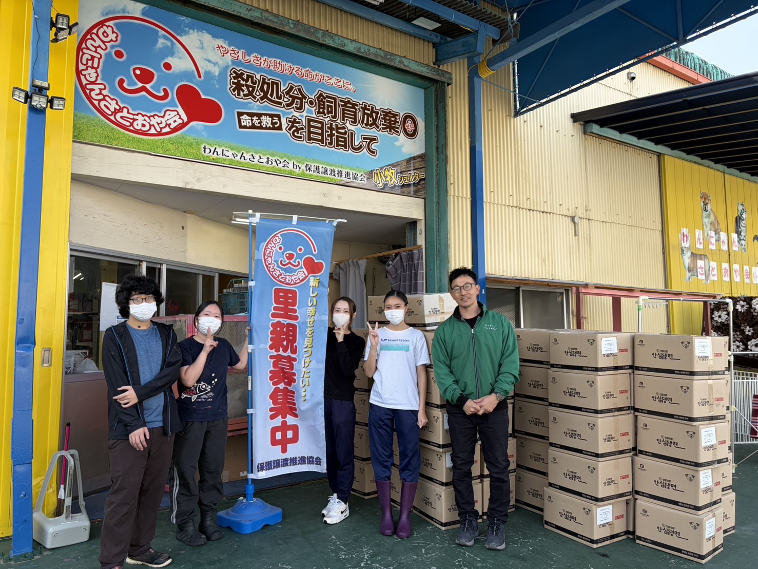 店舗前には「殺処分・飼育放棄をなくし、命を救う」という強い想いが掲げられ、日々多くの保護犬・保護猫たちの命をつなぐ活動を続けておられます。今回、私たちは“食品を扱う企業”として、命に直結する「食」を通じてその活動を支えたいという想いから、まとまった数量のペットフードをお届けしました。